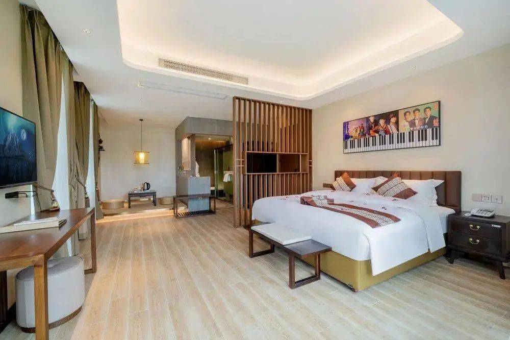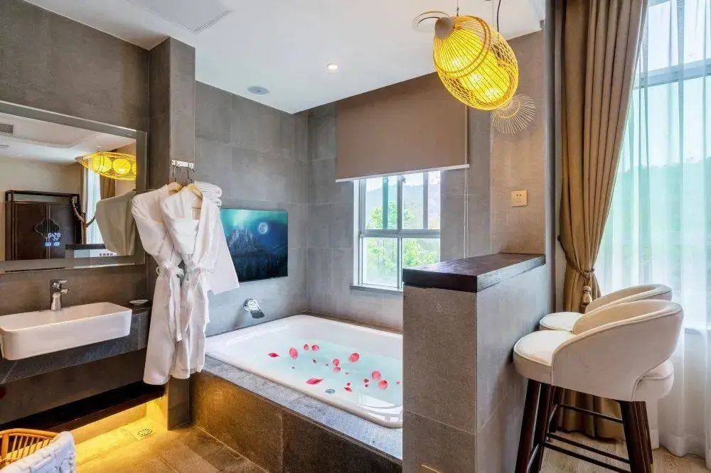客房室内引入天然温泉水让您随时都能享受温泉养生沐浴是与朋友欢聚的休闲去处也是周末放空的理想居所