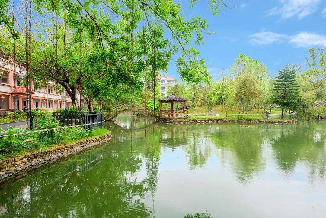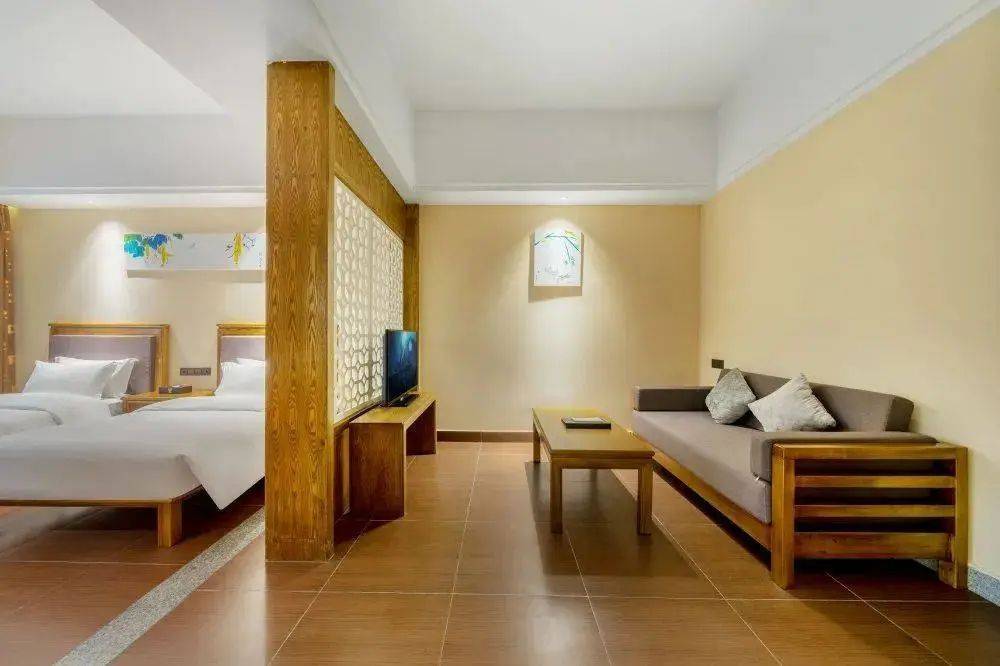 酒店客房以现代风格诠释客家及唐代宫廷韵味融合了中国传统建筑与都市风情着重于自然与人文之间和谐平衡的建筑理念静流无缝穿越其中将低层建筑群、花卉园林、湖景、庭院巧妙结合
