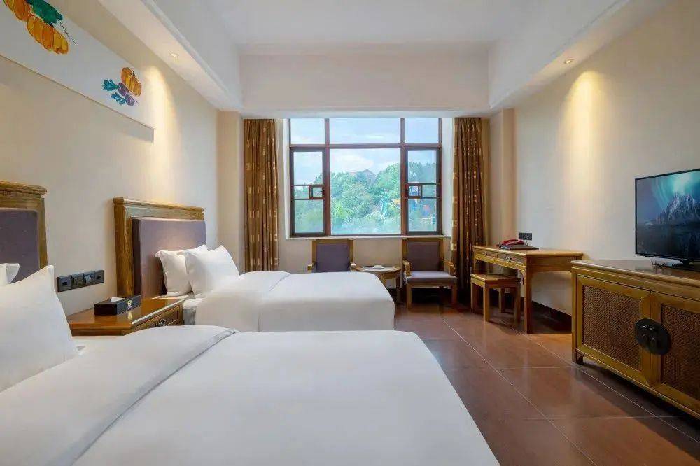 【河源·荣佳国韵温泉酒店】全年通用!平日周末不加收!无套路~不限次泡园林温泉泡池!¥368元抢豪华双床房1间1晚+2大1小营养早餐+无限次温泉+夏天水上乐园畅玩+免费使用篮球场、羽毛球场!