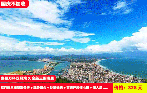 【惠州万科双月湾X全新三期海景】国庆不加收!大阳台赏海上明月~3分钟到沙滩畅玩放烟花!劲爆价:328元万科双月湾三期侧海景房+观景阳台+沙滩畅玩+西班牙风情小镇+情人堤、晒浪吧、礁石酒吧!大海沙滩就在