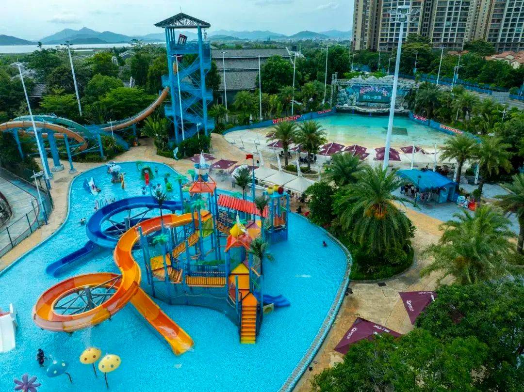 设有尖叫大回环滑梯、螺旋管道、超级造浪池