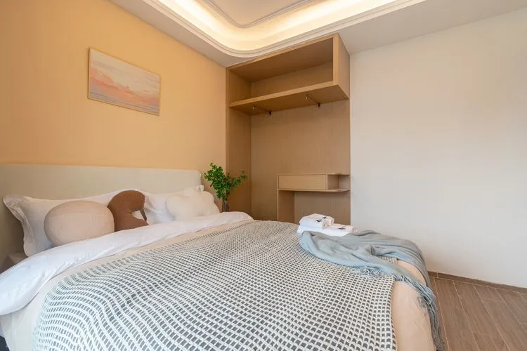 暖黄色的顶灯、饱满的床垫、简约的布局