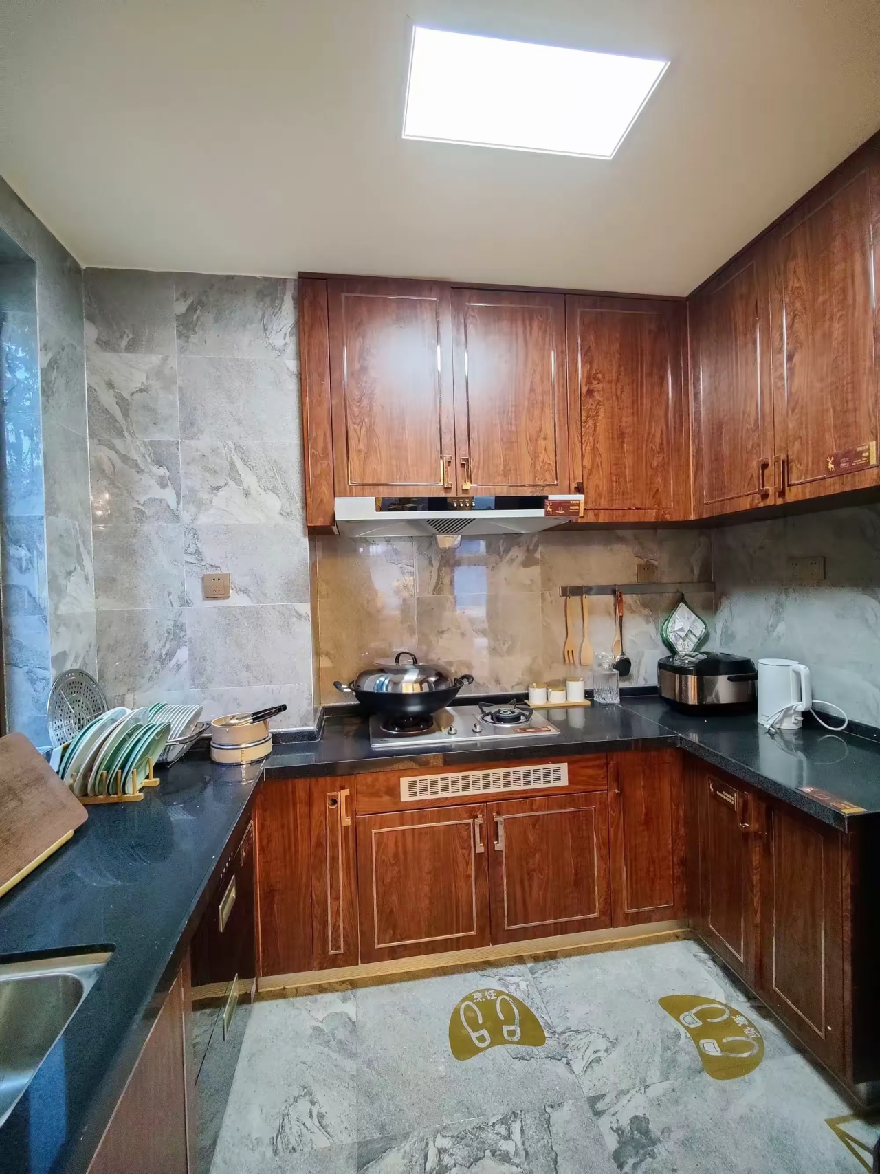 9、厨具:燃气灶、电饭煲、电磁炉、电冰箱、刀具、砧板等(食材、调味料、一次性碗碟自带),厨房厨具使用后清洗,未清洗的加收卫生费