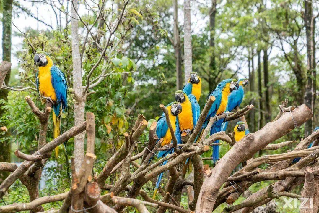 绯红金刚鹦鹉和蓝黄金刚鹦鹉们排着队