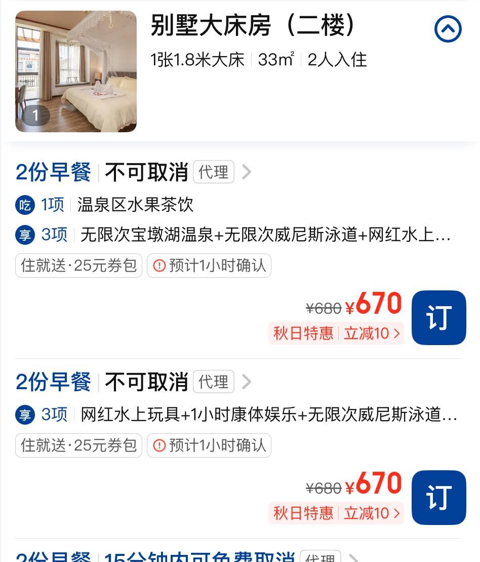 1.需在14:00之后办理入住,次日12:00之前退房,抢购套餐为抢购套餐为别墅豪华大床房或双床房,大床1.8米,双床房1.2米X2张,可升级亲水大床套房或3房别墅,房间带有客厅和私家温泉泡池,赠送2池温泉水,抢购套餐房间不含私家温泉泡池