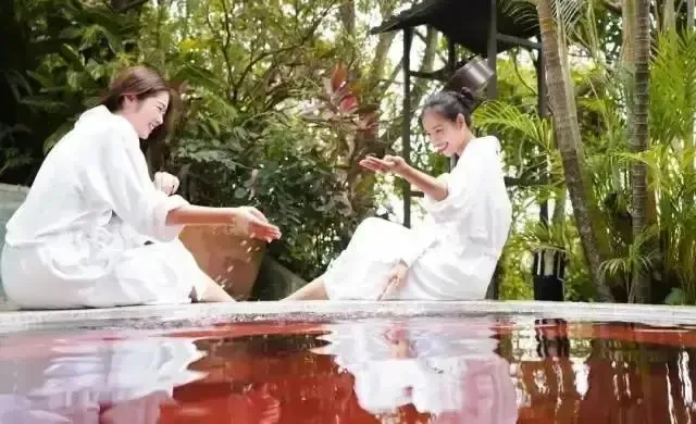 玩累了再去温泉区泡泡,巴厘岛式的园林风格