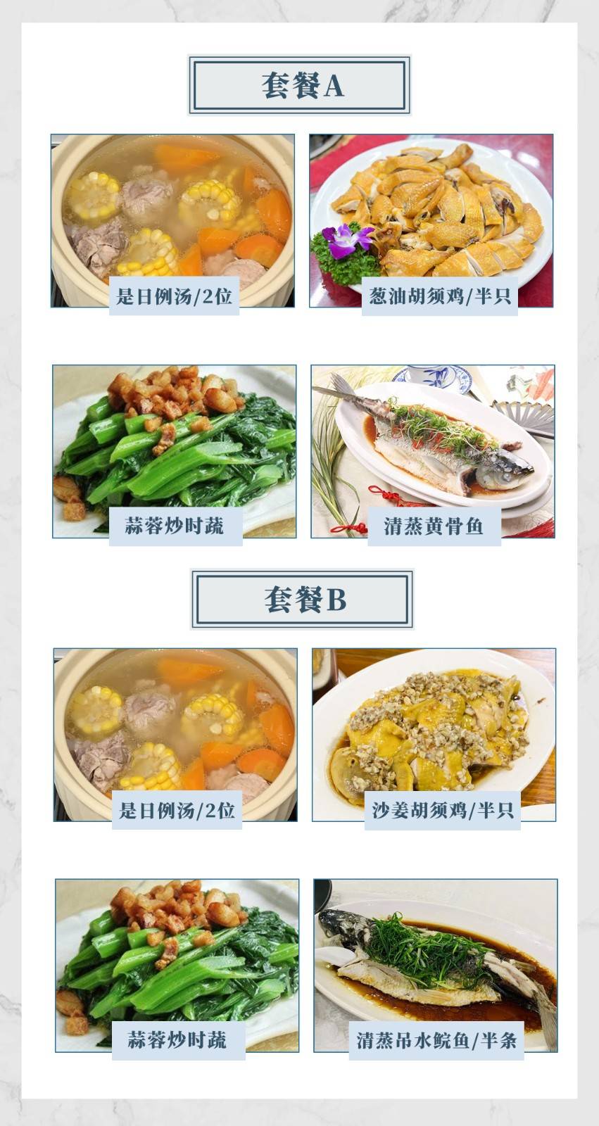 1、葱油胡须鸡半只,2、清蒸黄骨鱼/吊水鲩鱼