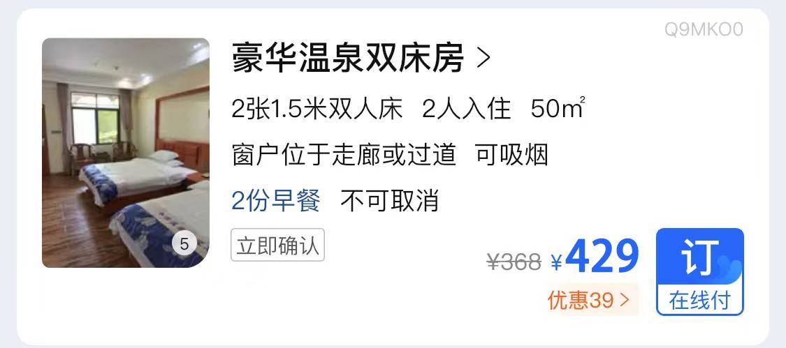 *可选升级酒店温泉小2房1厅(1.8米大床+1.5米双床,独立温泉池,麻将桌,KTV)需加收330元,周六加收:430元,春节假期叠加加收
