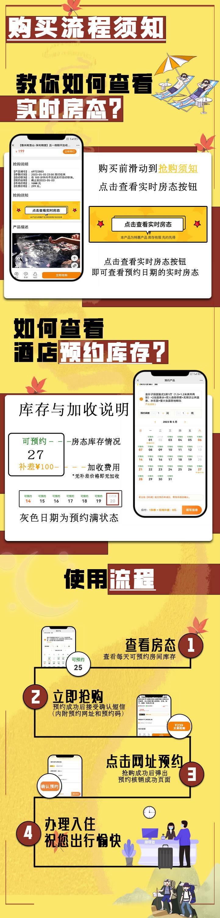 8、每天房间有限,请您务必提前时间预约入住日期,房间先预约先得,预约成功不设退改。为避免下单后因库存不足无法预约,请先查看房态在进行购买。(因房态不足,不作退款理由)