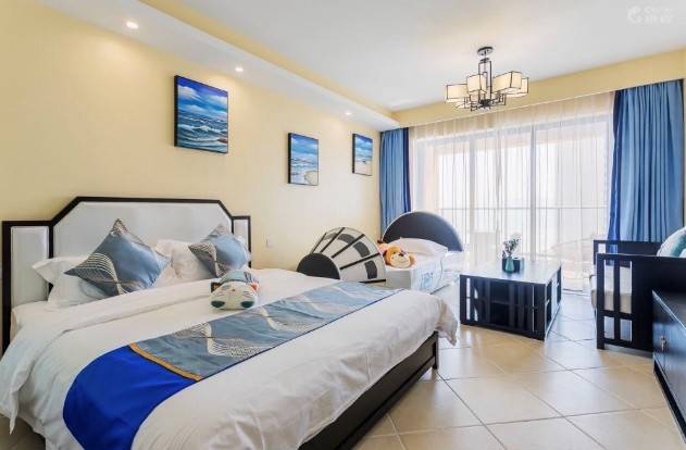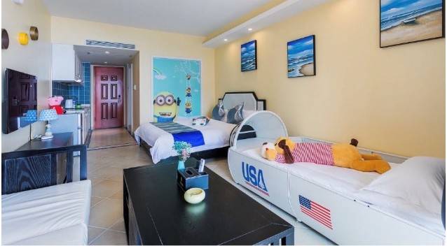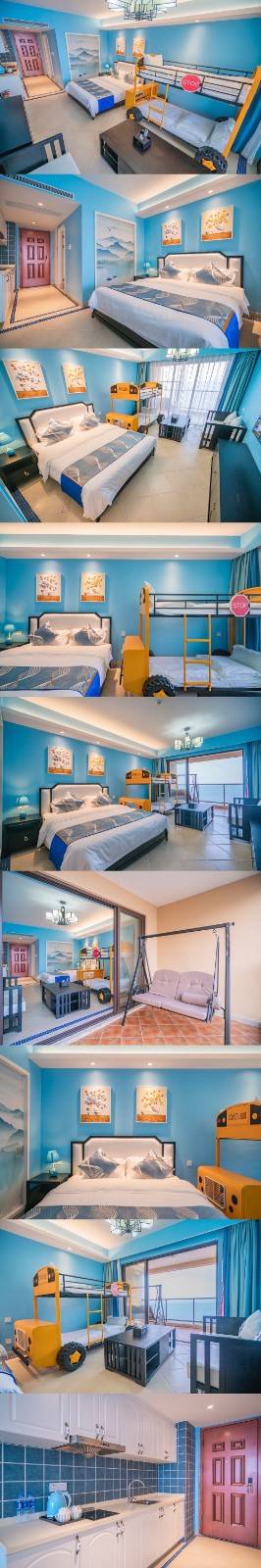 2、房型介绍:亲子主题装修风格,1.8米大床房+1.2米小床或上下床,房间带有阳台,可看到海景,配有一次性的洗漱用品,酒店距离沙滩大约步行5分钟