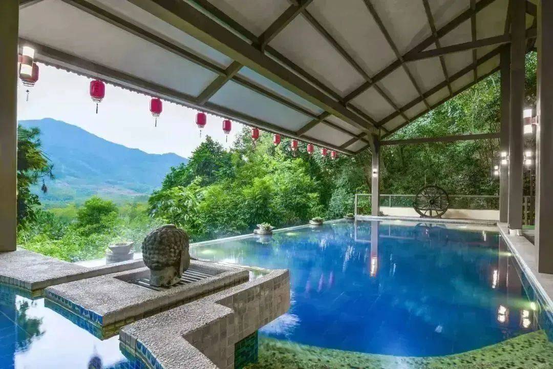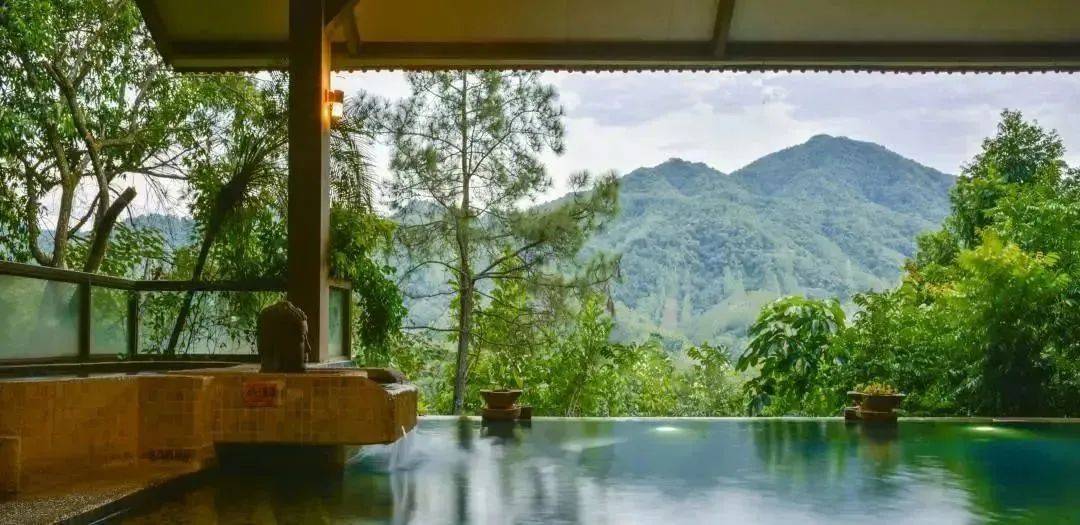 沿山而建的泡池郁郁葱葱,林木遮掩...
