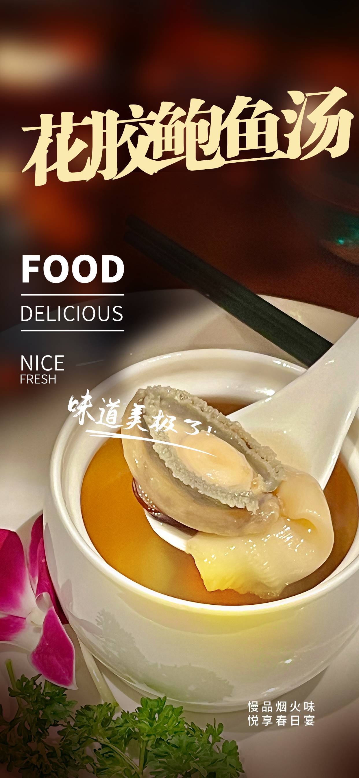汤底吸收了鲍鱼和花胶的精华和鲜味,且不含防腐剂、添加剂以及味精,轻轻勺起一点已经是满满的胶质感,饱满鲜嫩的汤汁真的让人口水直流。