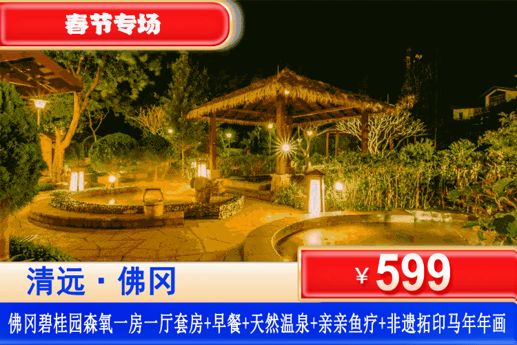 【清远·佛冈碧桂园】享地道清远鸡放题自助餐!春节专场一口价!¥599元住森氧1房1厅阳台套房+元气自助早餐+清远鸡豪华自助晚餐+泡凤凰湾天然温泉+亲亲鱼疗+养生石板床+非遗拓印马年年画!新年第一“泡”