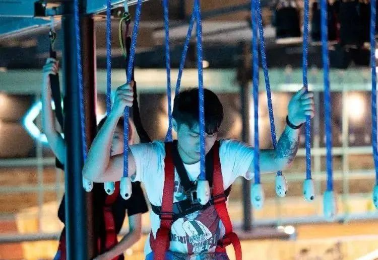 包括忍者的路,蹦床和攀岩,在安全带全