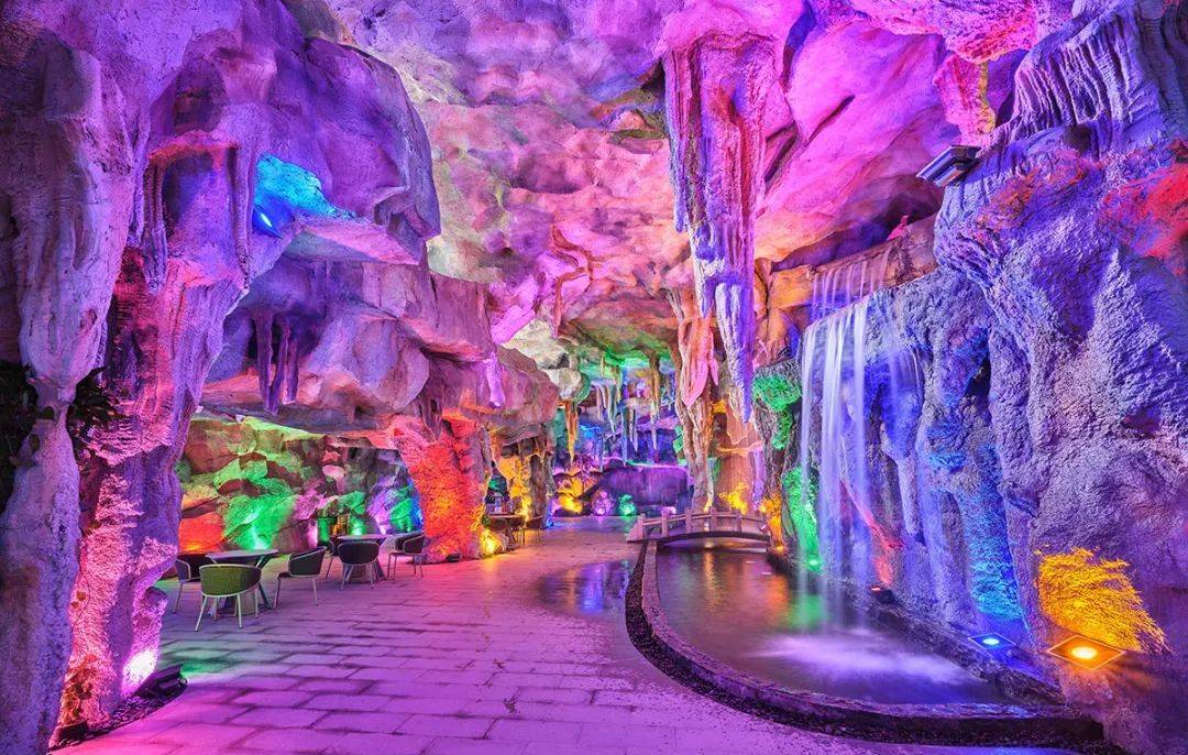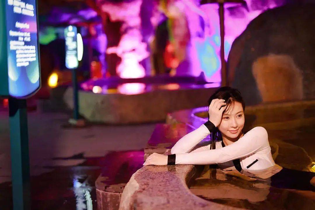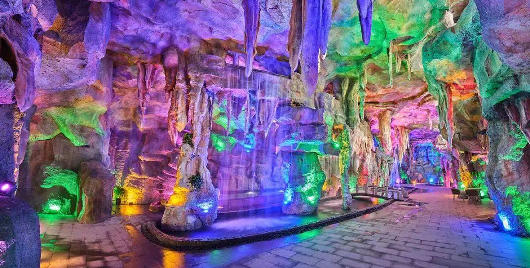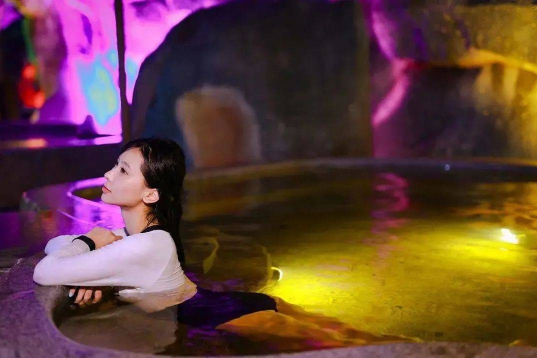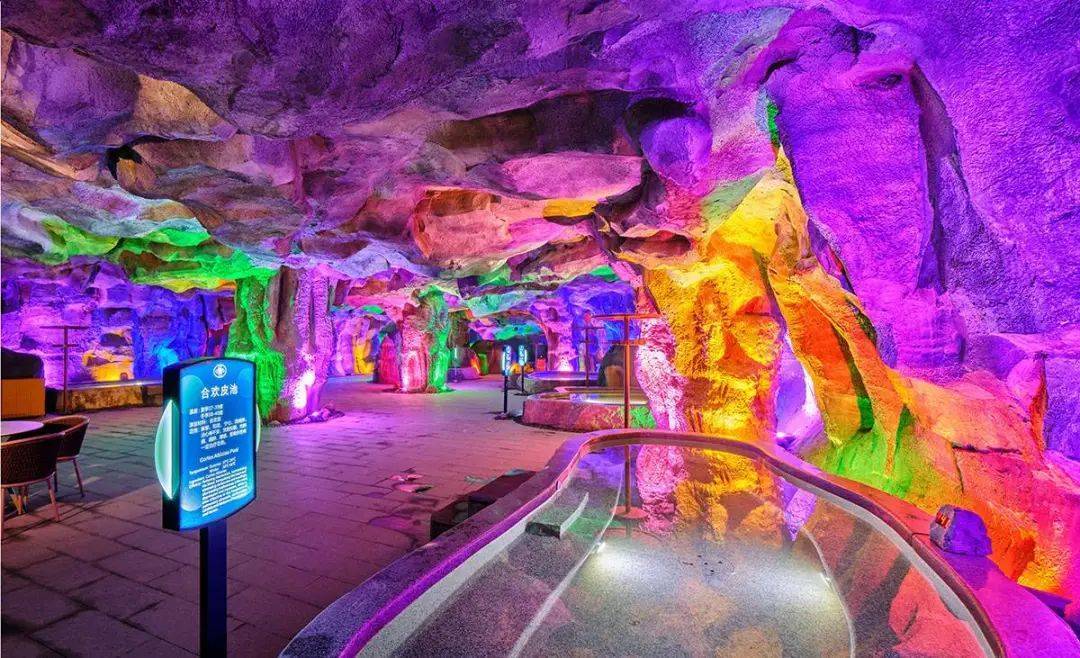 幽深的洞穴中灯光迷离,温泉雾气缭绕,