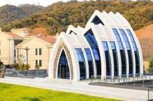 光与影的变幻中,翡翠般碧绿的湖水倒映着泉谷礼堂;