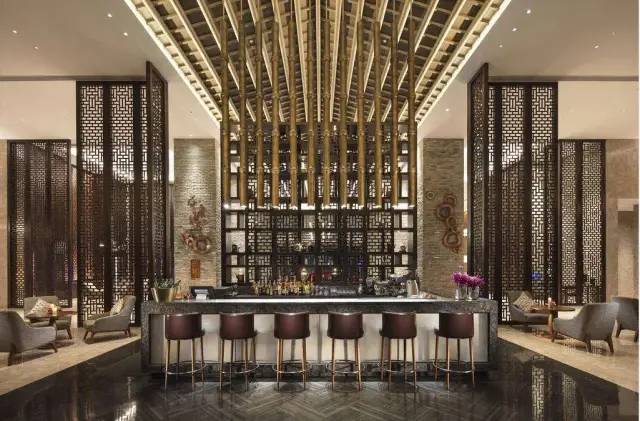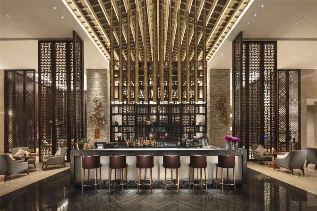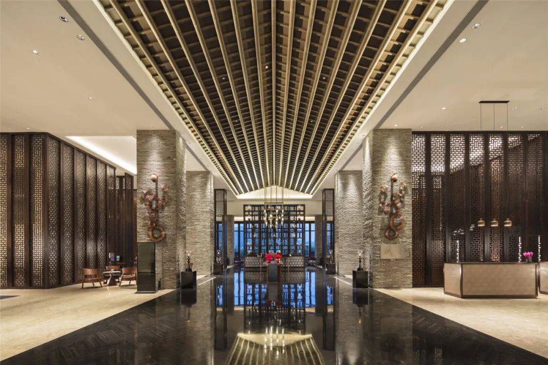 大堂以灰色大理石、客家砖、柚木、