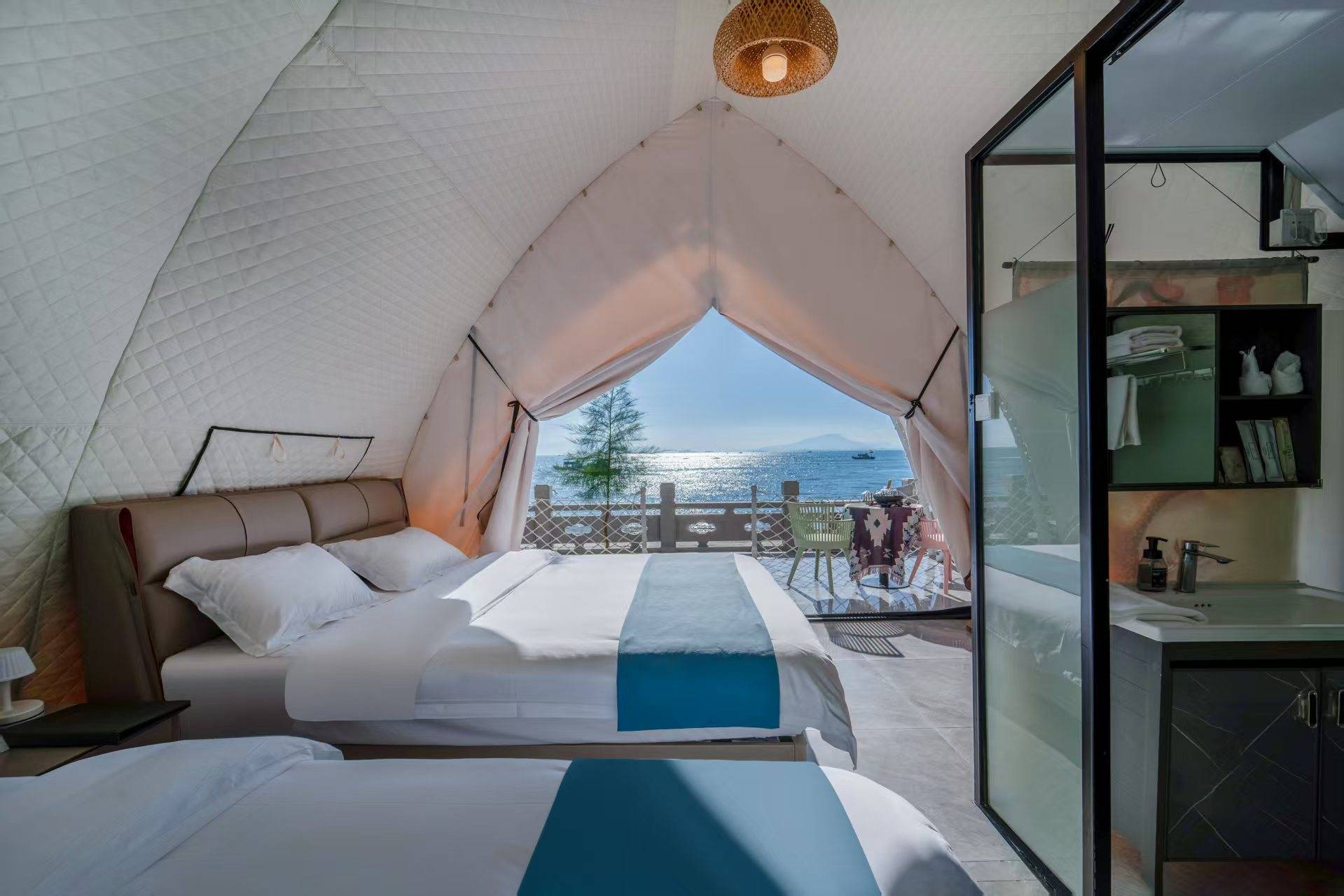 【惠州巽寮湾|星级露营】三面环海的赶海圣地!平日不加收,春节可用!¥299抢惠州巽寮湾双鱼岛半岛秘境双床房+独立卫浴和空调+下午茶1份+免费停车等,听着海浪声入眠,与大海零距离接触~