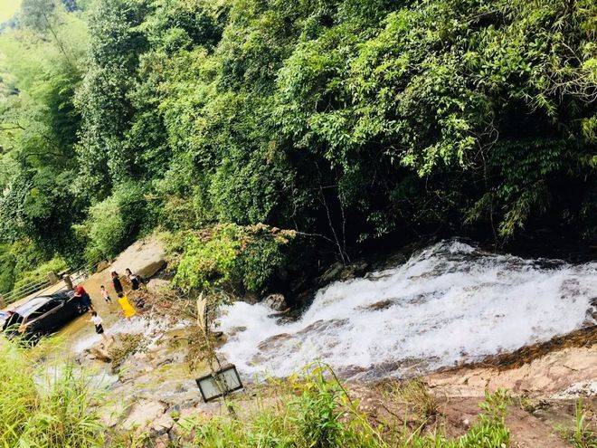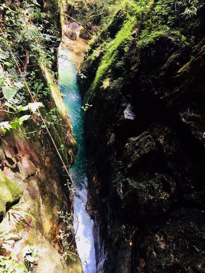 来到峡谷底,从下往上看,瀑布就像一块巨大的白纱布披在青山之上。